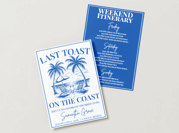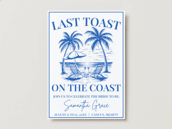 Planning a beach bachelorette party? This Last Toast on the Coast Bachelorette Invitation is the perfect way to set the vibe for a coastal celebration. Designed as a Canva bachelorette invitation template, it’s fully editable and easy to customize. Personalize your bachelorette weekend invitation with names, dates, and event details in just minutes.
